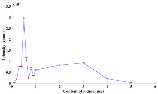From Figure 2, the emission intensity of excimer lamps increased first and decreased later with an increase in the content of I2 roughly, which agreed with the statement above. The emission intensity reached a peak when the content of I2 was 0.5 mg. Thus, combined with both theoretical analysis and experimental outcome, the content of I2 was chosen as 0.5 mg in this paper.