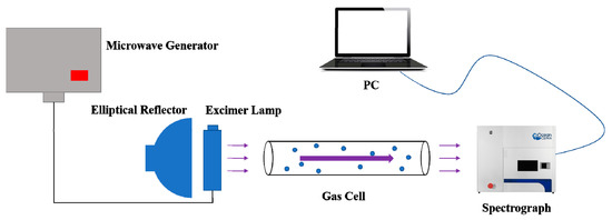 From Figure 3, the optical path length of the gas cell was 0.8 m, and the model of the spectrometer was OceanOptics MX2500+. A microwave generator comprised a transformer and a magnetron. A generated microwave was transmitted to an excimer lamp through a cable. The gas molecules were excited by the microwave and generated UV light, which entered the gas cell and was absorbed by the investigated gas. The elliptical reflector behind the excimer lamp was employed to enhance light intensity of the investigated gas. Then, the transmission light arrived at the probe of the spectrometer for detection. Finally, data obtained from the spectrometer were transmitted to a PC for further processing.