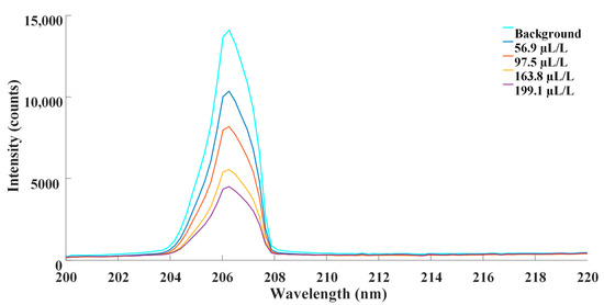 where represents the initial intensity of UV light, represents the transmission intensity of UV light, represents the optical path length, represents the absorption cross-section of the investigated gas, represents the concentration of investigated gas and represents the wavelength of incident light. In addition, absorbance is denoted as .