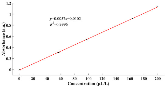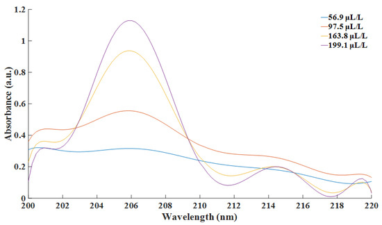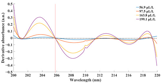 From Figure 6, it could be observed that the zeros of four derivative absorbance spectra met at the point of 205.79 nm. The fact indicated that all four spectra reached their extremums at this very point. Combined with original spectra, the absorbance at this point was the maximum. According to the theory of absorption spectroscopy, a more prominent phenomenon contributed to better performance of the detection system. Ergo, the experimental data at the wavelength of 205.79 nm were used for further calculation and analysis. Linear fitting between absorbance and concentration at this wavelength was as Figure 7.