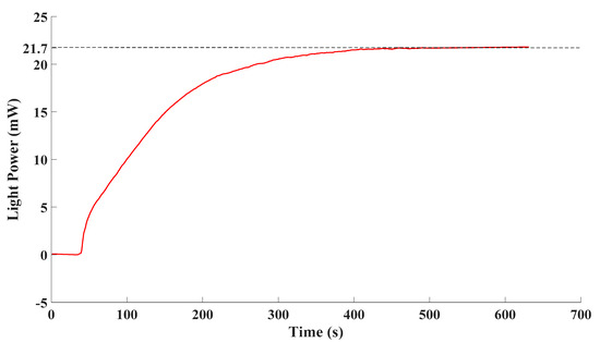 The excimer lamp was switched on at 30 s, and after a period of ascending, the light power tended to be stable. Finally, the light power fluctuated around 21.7 mW. The standard deviation of stable data was 0.111% of the average of stable data. It can be observed that the fluctuation degree of the emission was quite small once the excimer lamp stabilized. In that case, drift of the output of excimer lamp over time could barely be observed.
