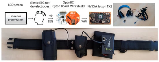 Top: pipeline of signals within the Biohub architecture (left); EEG headset plugin (right). Bottom: mobile configuration of the Biohub (from left to right: power bank, USB modem, embedded system based on Jetson TX2 and Orbitty carrier board in a metallic case).