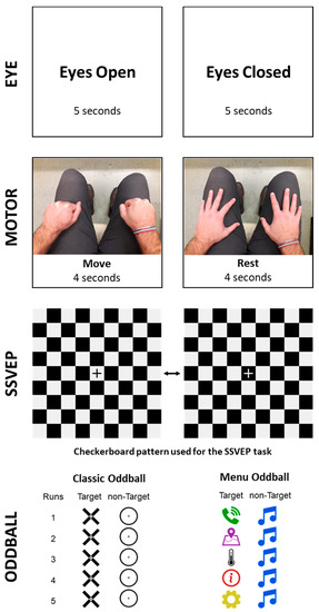 Schematic representation of the Eye and Motor tasks. Stimuli used in the SSVEP and Oddball tasks.