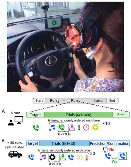 Visual representation of the BCI tasks. Upper picture shows a participant from the back wearing the EEG headset of the Biohub and performing the in-car session of the experiment. Panels (A,B) show the schema of the protocols used in the in-lab and in-car sessions.