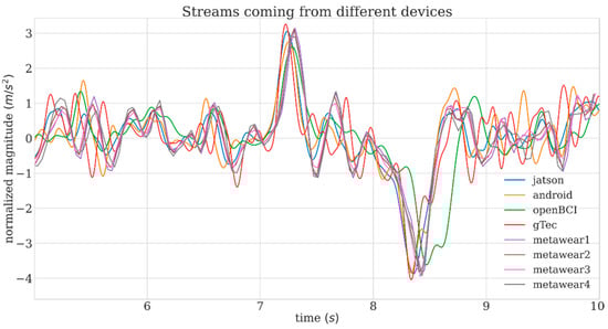Accelerometers’ data coming from the devices were loaded from the recorded files using the pyxdf module (version 1.13, see https://github.com/xdf-modules/pyxdf, accessed on 29 November 2021) with default parameters (enabled clock synchronization and jitter removal). Then, data were resampled to 1000 Hz, and a cross-correlation analysis was performed on the data chunks where a perturbation was present. This procedure returned statistics of the offsets among streams after each system reset.