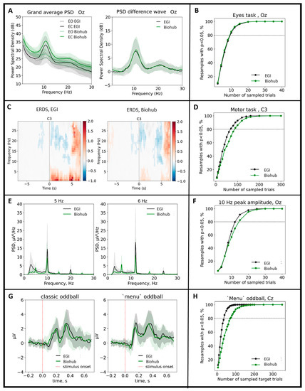 EEG features and corresponding statistical power computed for the eye (panels (A,B)), motor (panels (C,D)), SSVEP (panels (E,F)) and oddball tasks (G,H) to compare the performance between the Geodesic (black) and the Biohub (green) system. Shaded colors show standard deviations around mean.