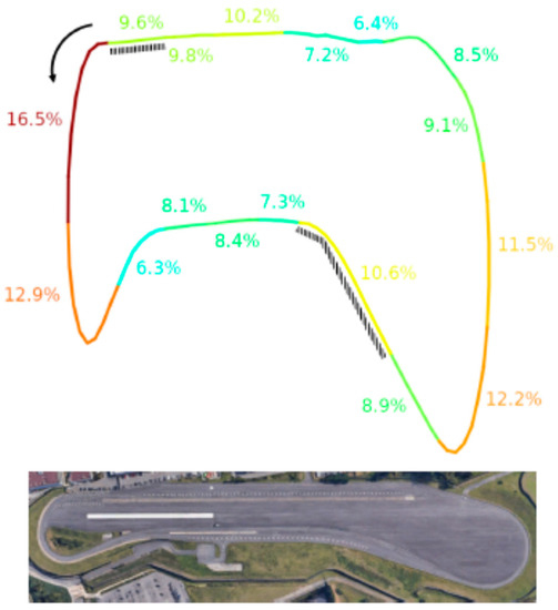 Epoch rejection rates of discarded trials in the different sections of the proving ground. The sections are color-coded based on the magnitude of the corresponding rejection rates. The arrow on the top-left corner indicates the driving direction, and the dashed markers highlight the lane-merging sections. The bottom aerial picture shows the real proportions of the proving ground.