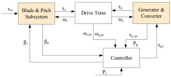 The wind turbine benchmark model proposed in [22] is a three-blade turbine with a full converter coupling, which comprises four parts: the blade and pitch subsystem, the drive train, the generator and converter, and the controller, as illustrated in Figure 1. It is a variable-speed and pitch-controlled turbine. The variables between the four subsystems are defined as follows: the wind speed denoted by acts on the blades and goes into the blade and pitch subsystem. The controller provides the pitch position reference to the blade and pitch subsystem and the torque reference to the generator. is the measured pitch position. The drive train converts the rotor torque and the generator torque to the rotor speed and the generator speed . The rotor speed and the generator speed are separately measured by and . The generator and converter subsystem utilizes the generator reference torque to obtain the torque . is the power produced by the generator, which follows the reference power through the controller. The blade and pitch subsystem and the generator and converter subsystem are the critical parts of wind turbines, denoted by the orange rectangles in Figure 1. We research the two subsystems and their corresponding fault scenarios in detail in this study, the relevant parameters in these two subsystems are consistent with those in the reference [22].