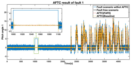 The pitch angle 1 output in the injected fault and fault-free cases are illustrated in Figure 4, represented by the blue line and the black line separately. We adopted the proposed AFTC method to tolerate the sensor fault, and the result is represented by the red dashed line. This line approaches the black line during the faulty period, which means that the proposed AFTC scheme effectively recovers the faulty system to the nominal situation. Besides, we also designed the adaptive observer proposed in [37] to realize the AFTC, which is displayed by the yellow dashed line. It also approaches the black line from 1000 s to 1100 s. However, the red dashed line approaches the normal pitch angle value faster and closer than the yellow dashed line. Therefore, utilizing the FAFE algorithm has a better performance than the baseline to achieve the AFTC goal. The detailed comparison over the segment from 1000 s to 1100 s is also shown in the top left section of the figure.