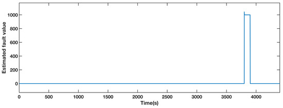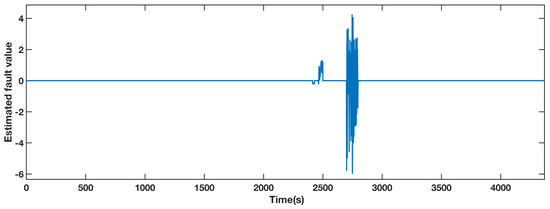 The estimated fault value obtained by the adaptive observer designed for pitch 1 is shown in Figure 3. The measured value of the sensor contains both the actual value and the noise in the benchmark model. Due to the effect of the noise, the estimated fault value is within the range of [−1.5, 1.5], while it deviates from this range from 1000 s to 1100 s. Therefore, the fault can be located in pitch 1 according to the performance of the estimated fault.