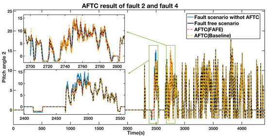 A gain factor of 1.2 times the normal measured value of sensor fault during 2400 s to 2500 s and an actuator fault from 2700 s to 2800 s were injected to the pitch 2. The estimated fault value from the adaptive observer is displayed in Figure 5. The estimated fault obviously diverges from zero during the faulty periods, thus locating the fault. The pitch angle 2 AFTC outputs are compared in Figure 6. The details of the actuator fault and the gain factor fault are shown in the top left section and the bottom left section, respectively. The tendencies of the red and yellow dashed line, representing the fault scenario with AFTC by adopting the FAFE algorithm and the comparative reference [37], maintain normal. In the case of sensor factor fault from 2400 s to 2500 s, both the red line and the yellow line are close to the black line, representing the healthy operating output. Nevertheless, the FAFE algorithm shows better accuracy than the baseline. Therefore, the AFTC scheme can address the faults that occur on pitch 2, and adopting the FAFE algorithm also enhances the performance of this component.