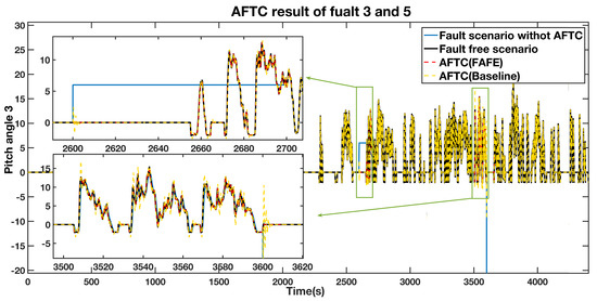 A fixed value fault equals from 2600 s to 2700 s, and an actuator fault from 3500 s to 3600 s affect pitch 3. The simulation results are presented in Figure 7 and Figure 8. According to Figure 7, the blue line, which represents the estimated fault, significantly diverges from the normal operation during the faulty time. Therefore, we can deduce that the faults occur during these two periods. The four situations are also compared in pitch 3, as shown in Figure 8, and a detailed comparison of the sensor fault and the actuator fault are depicted in the top left and the bottom left section. During the faulty period, the AFTC scheme adopting the FAFE algorithm represented by the red dashed line and the baseline illustrated by the yellow dashed line recover to normal as the fault-free case denoted by the black line. Besides, the red line is closer to the black line than the yellow one. Therefore, the proposed method can achieve the AFTC requirement for pitch 3, and the fault tolerant result is effectively improved by applying the FAFE algorithm in the adaptive observer.