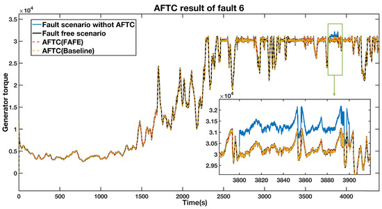 An actuator fault from 3800 s to 3900 s causes a generator torque an offset of 1000 Nm. Figure 9 shows the estimated fault obtained by the FAFE algorithm. The blue line is the output value, and it significantly deviates from 0 between 3800 s to 3900 s, thus the fault can be located. Figure 10 illustrates the output of the generator torque under four conditions, and the bottom right section shows the details of the faulty period. Both the red and the yellow dashed lines, which represent the AFTC schemes adopting the FAFE and the baseline, recover to the normal operation state. Therefore, it can be deduced that the FTC method perfectly tolerates the actuator fault in this subsystem.