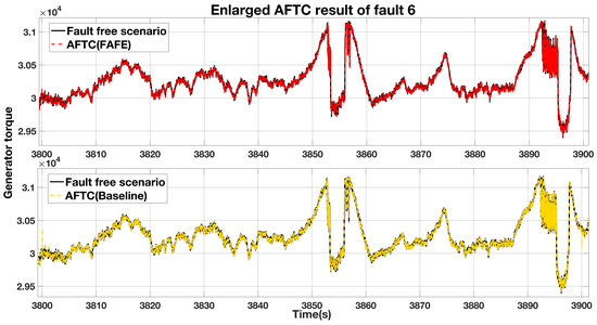 To compare the FAFE algorithm and the baseline in this subsystem, we enlarge the faulty period in Figure 10 and re-contrast in Figure 11. The comparison between the fault-free case and the AFTC scheme with the FAFE algorithms is shown at the top of the figure, and the comparison with the baseline is displayed at the bottom. From Figure 11, we can see that both the AFTC schemes stabilize the faulty system and have similar performance. However, the FAFE algorithm performs better at the beginning and the end of the faulty period.