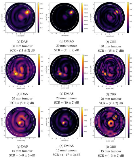 Figure 2 displays typical reconstructions produced by the DAS, DMAS, and ORR algorithms. Figure 2a–c displays reconstructions of a 30 mm diameter tumour and is typical of a case where all three beamformers successfully identified the presence of the tumour inclusion based on the quantitative criteria described in Section 2.4. Figure 2d–f displays reconstructions of a 20 mm tumour and demonstrates the generally observed trend, where the DMAS and ORR reconstructions had higher SCR than the DAS reconstructions. Figure 2g–i displays reconstructions of a 15 mm tumour and demonstrates typical reconstructions produced by the beamformers when the tumour is not accurately detected. While the SCR of the DAS and DMAS reconstructions are negative, the true tumour location does not correspond to a visual image feature, and the central high-intensity localized region of the reconstructions visually appears similar to that of a tumour response (as in Figure 2d–f). This hot-spot artifact was present in many DAS and DMAS reconstructions and obfuscated the true tumour response. Notably, the ORR reconstruction does not have a single localized high-intensity region, as in the case of the DAS and DMAS reconstructions, but instead has two distinct relatively high-intensity regions—one occurring near the center of the image (as in the DAS and DMAS reconstructions) and the other at the known location of the tumour.
