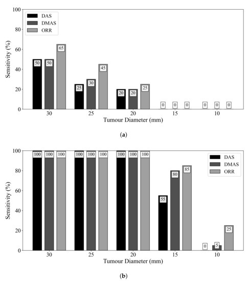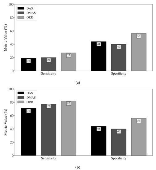 Figure 3 displays the diagnostic sensitivity and specificity obtained by the DAS, DMAS, and ORR algorithms when (a) an adipose reference scan is used for ideal skin suppression and (b) when an adipose and fibroglandular reference scan is used for ideal skin and clutter suppression. The subtraction of a reference scan containing both adipose and fibroglandular tissues allows for the removal of all responses not due to the tumour (neglecting secondary and higher-order scattering). While this suppression is not clinically practical, it allows for insight into the effects of the fibroglandular inclusions on the diagnostic performance of the reconstruction methods. When ideal skin suppression is used, as displayed in Figure 3a, no beamformer has a practical sensitivity. If adipose and fibroglandular reference subtraction is performed, the beamformers have improved performance that is within the range of reported sensitivity estimates in the literature (74–100% in [8,9,32,33,34,35,36,37]). The specificity of the DAS and DMAS beamformers was observed to be worse than a random classifier acting on images of healthy breasts. Only the ORR algorithm achieved a specificity better than 50%.