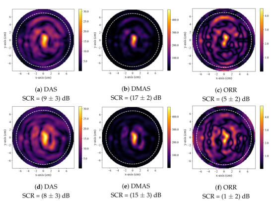 An automated and quantitative tumour-detection metric was used in this work to evaluate the diagnostic sensitivity and specificity of the DAS, DMAS, and ORR methods. The tumour-detection criteria used in this work were the same as described in [32]. If the SCR of an image was greater than 1.5 dB, then that image was labelled as containing a tumour because a large SCR indicates a high-contrast, localized region within the image. For reconstructed images of healthy phantoms, this was the only criterion used to evaluate the label of the image—all healthy images with dB were labelled as false positives, and all healthy images with dB were labelled as true negatives. For reconstructed images of tumour-containing phantoms, if the dB, the image was labelled as a false negative. If the dB, the localization error was also evaluated. If the localization error was , where was the known radius of the tumour and was the uncertainty in the polar position of the tumour, then the image was labelled as a true positive, because the highest-intensity point in the image was found to be within the expected tumour region. If , then the image was also labelled as an incorrect prediction and was treated as a false negative when calculating the sensitivity of the reconstruction method.