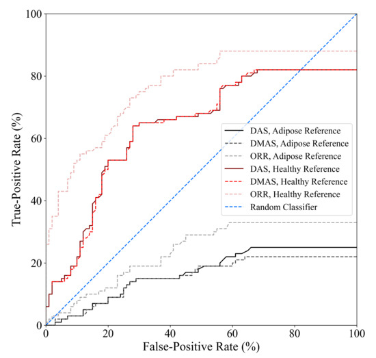 ROC curves of the DAS, DMAS, and ORR algorithms when either adipose-only phantom scans or healthy (adipose and fibroglandular) phantom scans are used as references for artifact suppression, determined using one thousand linearly spaced SCR thresholds between 0 and 30 dB. The ORR outperformed the DAS and DMAS beamformers for all SCR thresholds.