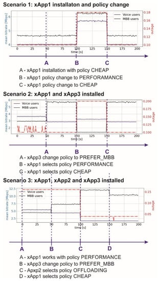 Scenario 2: Here, we extend the previous case to the situation where two separate xApps are installed, we observe interactions between them and react accordingly; thus, at 50 s, xApp3 starts preferring MBB users over voice users, thus the bitrate of MBB uses increases, and for Voice users, it decreases, leading at the same time to an improvement of outage probability; at 100 s, xApp1 chooses PERFORMANCE, which in this network state (i.e., location of users, their requests for resources) causes performance degradation; thus, the system selects again the CHEAP strategies at 150 s. This scheme shows the benefits of flexibility available to OSP—it can select the most suitable setup of the installed xApps and react immediately when any performance deterioration is observed. Please note that it is also possible to change or apply new policies within each xApp in order to adjust them to the current OSP needs. Such flexibility may not be easily available in a static, non-O-RAN scheme. This scheme also shows the prospective challenge that OSP has to face, i.e., maintaining the conformance of installed applications. Thus, the application of AI tools may be necessary.