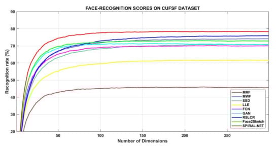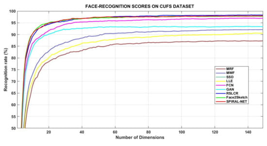 Table 7 records face recognition scores of these methodologies with help of the NLDA procedure, constituted of 142 features/dimensions of the images. Its graphical presentation is in Figure 3. RSLCR, Face2Sketch, and Spiral-Net performed superior to other methods. It is also evident that sketches synthesized by Face2Sketch and Spiral-Net contain more subtle information of the subject persons as compared to other methods since the former two algorithms attain 97% accuracy at 95 dimensions versus the 98% score of RSLCR at 142 dimensions. This improvement in the result also means lesser time complexity of the two methods to reach a rank-1 recognition level.