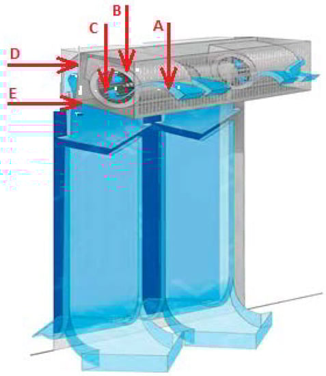 Principle of operation of the air curtain. A—front grille; B—fan baskets; C—injection wheel; D—air chambers; E—outlet duct.
