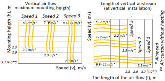 - The length of the air stream must correspond to the height (width) of the door. For example, at a curtain height of 2.3 m, the velocity of the air stream is approximately 5–7 m/s at the outlet of the air curtain and approximately 2.2 m/s at the floor level; in the studied case, at an installation height of 3.7 m at the outlet, velocity of the air stream is 9.6–11 m/s, and at the floor level, 2.3 m/s. If the length of the air stream is insufficient, the air curtain will be inefficient, immediately increasing the heat losses.