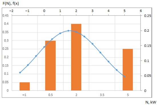 Energy consumption histogram and normal distribution function. N—calculated power; F(N)—frequency of a certain power drop in a given interval (orange columns); f(x)—the probability density curve of normal distribution (blue line).