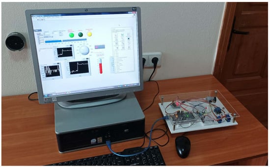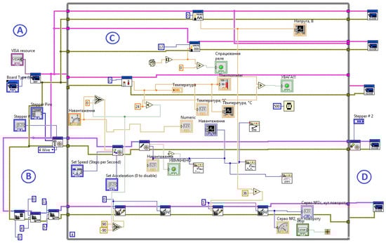 Using NI LabView software, a SCADA system was developed, the block diagram of which is shown in Figure 6. This software includes an interface, which provides automated control of the technological process and displays measured values and signals when a critical value is reached. In the window of the block diagram of the LabView project, the authors created a software to command the controller and immediately execute the algorithm of the system. The connection ports are set, and the progress of the execution is displayed in the front panel window, where the measured data can be displayed, as well as the status of the devices connected to the controller.