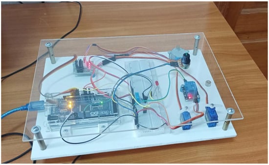 A pilot installation for controlling an air curtain based on an integrated Arduino board is shown in Figure 4. A set of hardware based on the Arduino board and the sensor DHT22 and the throttle valve ZD50 is shown in Figure 5.