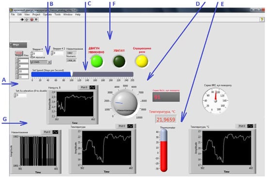 Control system interface. A—initial parameter settings; B—peripheral device connection to the COM port; C—air velocity control; D—load control; E—temperature control; F—signal controls; G—graphs of load, voltage, and temperature changes inside and outside the room.