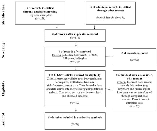 To source papers eligible for this review, we followed the principles of the PRISMA [19] framework, which provides a set of evidence-based guidelines for a systematic review and meta-analysis. The identification phase consisted of two parallel searches. First, we conducted a database search using Google Scholar and Web of Science, with a set of predetermined key words. Examples of keywords include: “collaboration”, “collaboration analytics”, “multimodal”, “sensor” and “group work”. For the second prong of our search, we gathered peer-reviewed articles from 2010–2020 conferences and journals that provided a publication for MMCA research. These conferences and journals were: the International Conference on Computer Supported Collaborative Learning (CSCL) and associated journal (ijCSCL), Conference on Computer–Human Interaction (CHI), ACM Transactions on Computer Human Interaction (TOCHI), International Conference on Learning Analytics and Knowledge (LAK), journal of Learning Analytics (jLA), International Conference on Educational Data Mining (EDM) and associated journal (jEDM), ACM Conference on Computer-Supported Cooperative Work (CSCW) and associated journal (jCSCW), IEEE Transactions on Learning Technologies (IEEE TLT), ACM International Conference on Multimodal Interaction (ICMI), and International Conference on Artificial Intelligence in Education (AIED) and associated journal (jAIED). We filtered the aggregated articles to select papers that were (1) full-length; (2) assessed collaboration instances between human participants; (3) collected at least one type of sensor data; (4) transformed at least one data source into metrics using computational methods (c.f., papers that solely used manually coded metrics from video recordings); and (5) connected metrics to at least one observed outcome. A visual representation of the study selection process under the PRISMA framework [19] can be found in Figure 1.