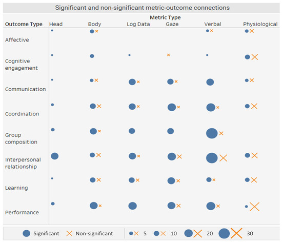 Figure 3 shows the count of connections made between a particular outcome and metric, with the circles representing success (i.e., statistically significant connection) and the x’s lack of evidence for a connection (i.e., statistically non-significant). The sizes of the markers signify the count—for example, the connection between performance and verbal metrics was found to be significant in eighteen cases, and non-significant in two cases. We note here that the statistical significance of a connection does not imply a strong connection between a metric and outcome. A statistically significant connection could be weak, but discovered due to a large sample size, choice covariates, etc., while the opposite may occur for statistically non-significant connections. In other words, our visualizations show the frequency of connections, and not their strength.
