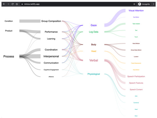 The results section follows this order. In Section 4.1 and Section 4.2, we present a taxonomy of sensor-based metrics and collaborative outcomes. In Section 4.3, we summarize how different outcomes have so far been connected to metrics using our taxonomy. Here, we introduce an openly accessible web-based visualization where the entirety of data-construct connections in our corpora can be interactively explored [23]. Our plans are to keep updating the database so that it may serve as a central repository for MMCA research. In Section 4.4, we investigate the role of theory in the data-construct research model, summarizing how theory integration has so far been carried out in research.