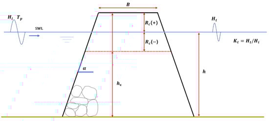 Here, is the crest freeboard, is the incident wave height, is the crown width is the surf similarity coefficient for breakwater (). However, in the aforementioned equation, the effective range of the wave transmission coefficient is limited to 0.075–0.8. Van der Meer [31] suggested a wave transmission coefficient equation based on the breakwater coefficient to improve the accuracy of the wave transmission coefficient (Equations (12) and (13)).