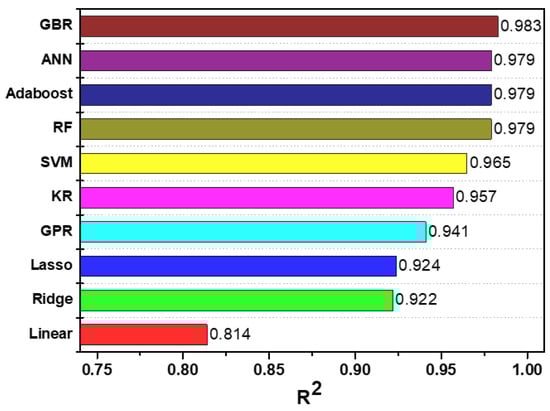 To verify the model performance of the GBR model, we utilized 10-fold cross-validation. This method was developed to minimize the bias associated with random sampling of the training set. The entire data sample was divided into 10 parts: nine were used for training, and one was used for model validation. The process of cross-validation was performed ten consecutively. The 10-fold cross-validation method ensured the generalization and reliability of the model performance. Figure 5 shows the model performance results obtained using the 10-fold cross-validation method. Figure 5a shows the results of R2 according to each fold and shows slight fluctuations; however, the minimum and maximum values were 0.958 and 0.987, respectively. Figure 5b shows the minimum value of 0.97 × 10−3, and the maximum value of 2.70 × 10−3 for MSE, showing that all errors are minimal, and a high level of accuracy is maintained.
