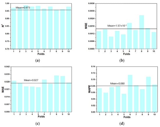 Table 4 shows the model performance and statistical information using the 10-fold cross-validation method. The mean R2 is 0.973, and the std is 0.009, demonstrating that the results have a small deviation. In addition, the MAE and MAPE are 0.027 and 0.080, respectively, indicating small prediction errors.