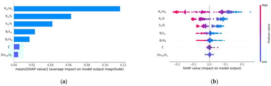 Around the coastal structures, the wave attenuation effect is not an action that is independent of the input variables, but rather a complex interaction dependent on the variables. Thus, the relative importance of each variable in the model unit to the total observations should also be analyzed. Since the importance of the input variable is a measure of how much the variable affects the dependent variable, analysis for the correlation between the input and dependent variables is important. Therefore, we analyzed the importance of variables that affect the wave attenuation of the LCS. Figure 7 shows the importance of input variables that affect the dependent variable (wave transmission coefficient) when applying the 260 hydraulic model experiment results to the GBR model. Figure 7a shows the variable importance, and the x-axis represents the average of the absolute values of the Shapley values of the input variables throughout the data. In short, this means that the average influence of the input variable on the dependent variable, and the larger the x-axis value, the greater the influence on wave attenuation.