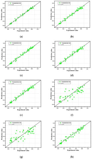 Predicted and experimental values for the eight combinations. (a): Combination 1; (b): Combination 2; (c): Combination 3; (d): Combination 4; (e): Combination 5; (f): Combination 6; (g): Combination 7; (h): Combination 8.