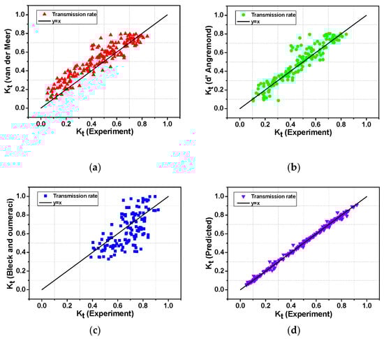 Comparison of predictive performance of empirical formulas and machine learning model. (a): Comparison of wave transmission formulas (Van der Meer) with experimental data. (b) Comparison of wave transmission formulas (D’Angremond) with experimental data. (c) Comparison of wave transmission formulas (Bleck and Oumeraci) with experimental data. (d) Comparison of GBR model with experimental data.