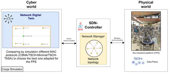 In order to validate the proposed Network Digital Twin architecture, we consider its application to the early design stage of an industrial project. The purpose of this project is to satisfy the real-time requirements of a control application that monitors the operation of a Flexible Production System (FPS) [36]. To do so, a WSN needs to be deployed to allow collecting information on the manufacturing operations carried out by the FPS. One raised question concerns which mechanism allows to meet our real-time requirements. As a preliminary step, a Network Digital Twin is built to assess the performance of the platform equipped with the WSN under three MAC protocols along with an oversampling mechanism. Figure 4 depicts the practical scheme of our proposed NDT architecture adapted to the considered industrial case study.