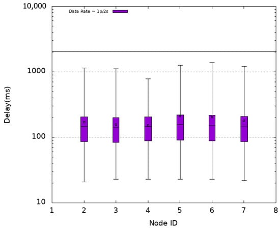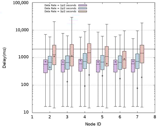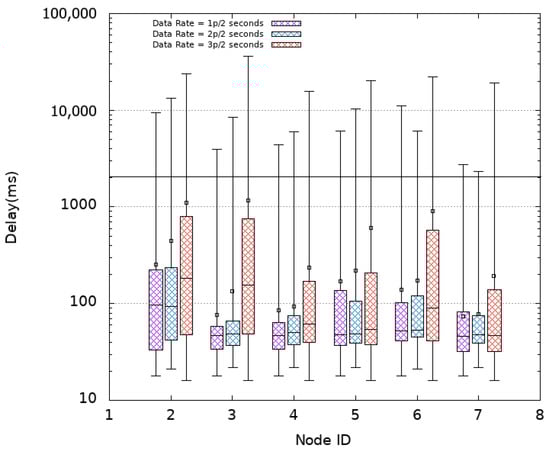 Experiments are first conducted using CSMA as MAC protocol without oversampling (i.e., using a data rate of 1p/2s) then an oversampling with 2p/2s and 3p/2s data rates is considered. Figure 5 plots the obtained delays (log-scale) when using CSMA for each sensor node numbered 2 to 7 in the x-axis. The horizontal line at ordinate 2 s recalls the refreshing time period. It is noted that all nodes obtain similar latencies for the different settings. This is due to the fact that they are located almost at similar distances from the Sink reached in one hop resulting in a star topology. In the absence of oversampling (1p/2s), an average delay of 719 ms with an average median delay of 575 ms is obtained. However, it is observed that some packets (about 6 % as shown in Table 2) arrive after a delay that exceeds 2 s. This translates into an average freshness indicator of while the PDR achieves its maximum value (). The distribution of PDR and FI obtained in the different experimented MAC protocols with or without oversampling are presented in Figure 6 and Figure 7, respectively.
