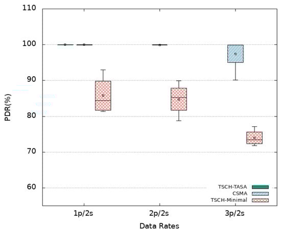 In addition to two network performance indicators, namely packet delay and packet delivery ratio (PDR), an application performance indicator called the freshness indicator (FI) is considered. The packet delay is the difference between the time of its reception by the Sink and its transmission time by a sensor node. The PDR is the ratio of the number of received packets by the Sink to the number of sent packets by the different sensor nodes of the platform. The FI is defined as the ratio of the number of periods in which at least one packet is received by the Sink within the period duration to the total number of periods of the whole simulation. In what follows, the simulations results are presented using box plots in order to visualize the distribution of obtained data points. Mean values are also plotted as empty squares inside the box plots.