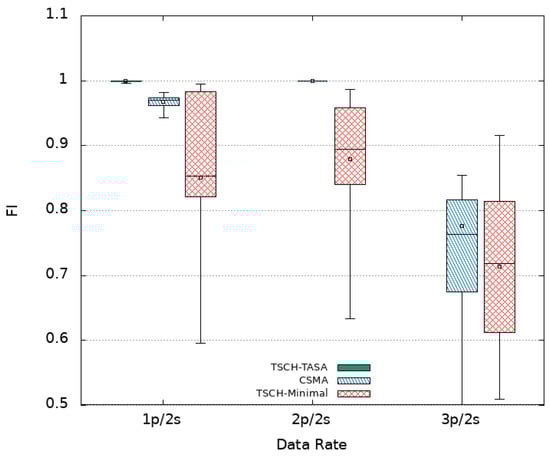 At this stage, is it worth applying oversampling? A priori no, but we further increased the transmission rate to confirm our assumptions. When duplication (2p/2s) is considered, the delays are slightly increased when compared to the case of 1p/2s with an average of 189 ms and a median of 57 ms. Duplication allows a slight improvement of the FI from to of the periods getting fresh data as shown in Figure 7 but decreases the PDR to as shown in Figure 6. It is noted that the FI box plot spreads over a wider range with a minimum value of and a maximum value of . The former value results from the of packets with delay exceeding 2 s and the latter (as well as the median) value is due to the fact that the probability of receiving a data packet within the two-second window is increased. Going further and triplicating messages (3p/2s) is not worth doing either since higher delays are experienced with lower PDR and FI values as we obtain and in average, respectively.