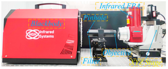 As shown in Figure 1, the experimental setup comprised a high temperature cavity blackbody, pinhole, band pass filter, custom objective lens, high-precision XYZ linear stage, control system, and the data processing system. The specific parameters are shown in Table 1. In addition, the infrared FPA with a cut-off wavelength of 2.5 μm is mounted on an XYZ linear stage.