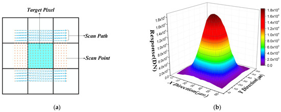 Diagram of the beam spot scan procedure and result: (a) schematic diagram of scan procedure; (b) beam spot scanning map of infrared FPA photodetector.