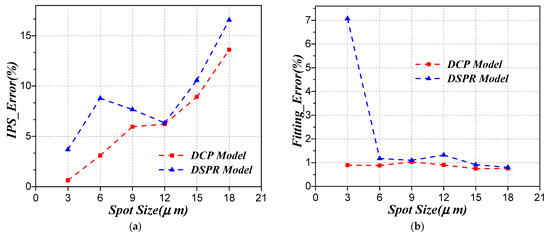 In order to further quantitatively compare the performance of different models of IPS characterization, we simulated different sizes of beam spot to scan the target pixel and calculate the IPS based on different models. The IPS calculated error and fitting error versus different size of simulated beam spot are shown in Figure 5 and listed in Table 2. It can be noticed that the IPS calculated error and fitting error based on the DCP model is smaller than the DSPR model for all different sizes of simulated beam spot. In addition, the calculation error of IPS based on DCP increases as the spot size increases, and the fitting error based on these two models is not very relevant to the size of the beam spot. From the above analysis, the proposed improved DCP model is better than the DSPR model for IPS characterization, and we can use smaller beam spot to scan the target pixel in order to obtain better IPS calculated results.