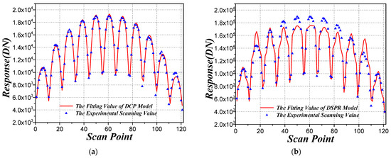 Beam spot scanning response map of the experiment and the fitting value of model (a) based on the DCP model; (b) based on the DSPR model.