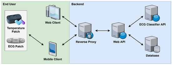 A high-level overview of the system architecture and its primary components are demonstrated in Figure 1. The system components can be divided into two major sections: (1) end user and (2) backend. The end user section consists of the sensory devices such as patches, the web client, and the mobile client. These components act as the primary interface for interacting with the system and are geographically distributed across diverse locations. The backend section consists of the reverse proxy, web API, ECG classifier API, and the database. These software-based components are hosted using cloud services and provide the core functionality of the system.