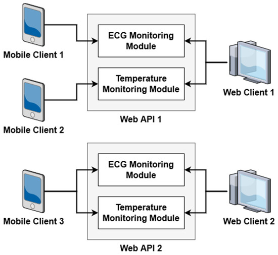The web API is designed around a module system. Each module provides all necessary components such as API routes and database mappings for a specific functionality. This approach allows for multiple deployments with varying feature sets as well as future extension through the inclusion of new modules. For example, new monitoring devices and the necessary functionality for handling its data can be added to the existing system, rather than requiring a complete rework of the system. The system includes two modules: (1) temperature monitoring, and (2) ECG monitoring. The web and mobile clients can provide access to all available modules or a subset as shown in Figure 2.
