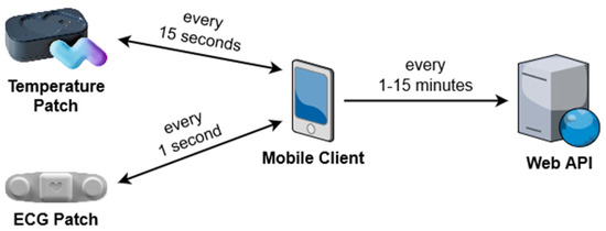 The temperature and ECG monitoring modules provide functionality for remotely monitoring the body temperature, heart rate, respiratory rate, and electrocardiogram readings of a patient. The patient’s vital signs are measured using a VV200 temperature patch and VV330 ECG patch from VivaLNK. As demonstrated in Figure 3, the patches connect and transmit data to the mobile client using bluetooth low energy (BLE). The temperature patch transmits data every 15 s while the ECG patch transmits data once every second.